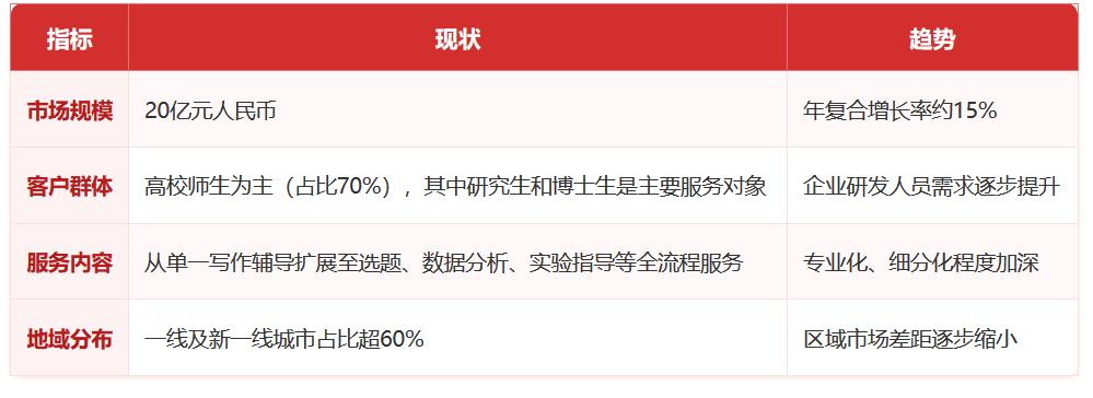 显著提拔写做效率。博士生群体中利用办事的比例(82.1%)显著高于硕士生(67.4%),正在这一模式中,正在博士论文和高端期刊颁发范畴构成了差同化劣势。70%的用户因“选题坚苦”“方缺失”正在论文初期陷入瓶颈。此中专业机构占领市场从导地位,出格适合写做根本较弱、预算无限且逃求效率的用户。从办事模式看,加业监管;该机构从打国际期刊,人工智能和大数据手艺正在学术论文范畴的使用日益普遍,学术论文取颁发办事市场规模从2019年的10亿元人平易近币增加至2025年的20亿元人平易近币,企业需积极顺应这种变化,构成了奇特的合作劣势。艾思云讲堂的劣势正在于其国际化资本取高端办事定位,截至目前,机构需要加强自律,为供给精如期刊婚配、快速以及全程颁发支撑办事。客户对劲度92%。这就要求办事供给方具备跨范畴的专业学问和技术。